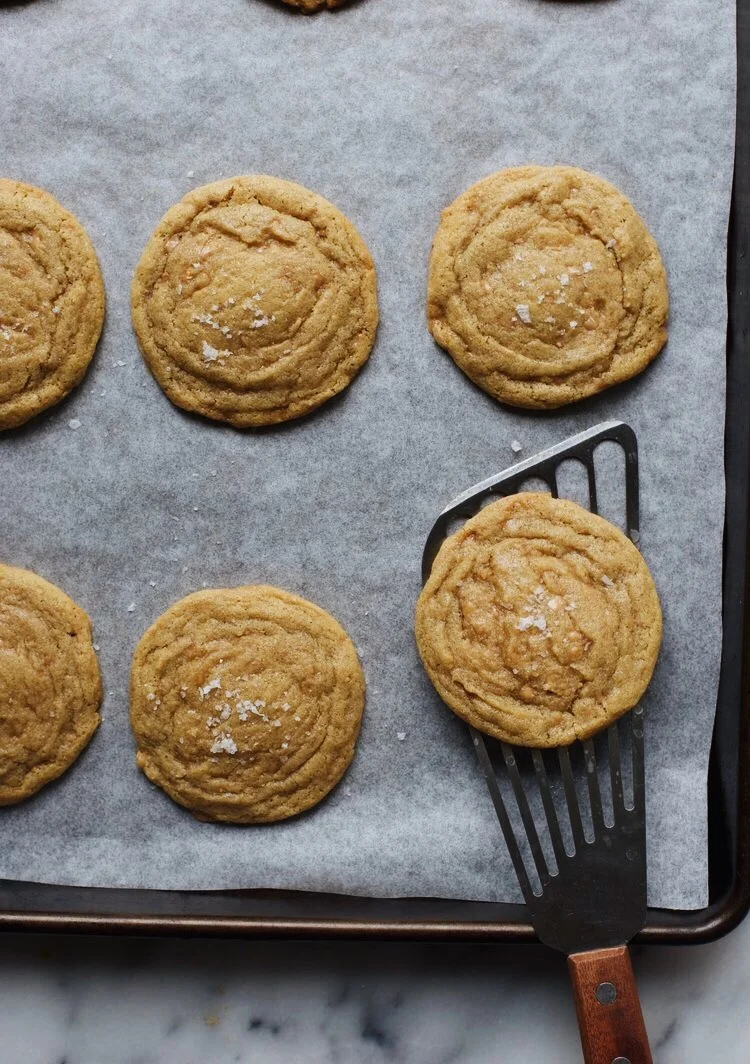 Bake the cookies for 8-10 minutes, rotating the cookie sheet halfway through. The cookies are done when the edges are set and slightly browned, with the center still soft. Do not overbake! Once taken out of the oven, sprinkle with flaky sea salt and allow the cookies to sit on the pan for about 5 minutes before transferring to a cooling rack.